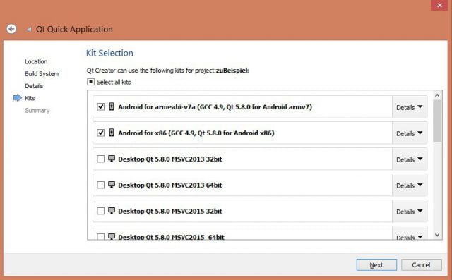 W dalszej kolejności nazywamy projekt, wyznaczamy docelowe miejsce na dysku dla folderu z danymi projektu i klikamy OK, aż dotrzemy do okna z wyborem zestawów narzędzi do debuggowania i kompilacji naszego kodu. W tym miejscu musimy zadbać o dostarczenie zestawów Android for x86, lub Android for armeabi. W zależności od używanego przez nas urządzenia.