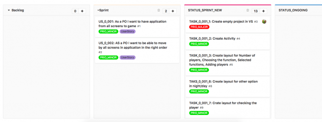 Jak widać nie zrobiłem zbyt dużo historyjek, a dwie które były w backlogu obecnie przeniosłem do sprintu. Jest za to dość sporo tasków, bo aż trzynaście. Mam teraz dwa tygodnie na ich zrealizowanie. Generalnie taski polegają na przygotowaniu interfejsu użytkownika i szkieletu aplikacji. Tak więc najbliższy czas poświęcę właśnie temu zagadnieniu.