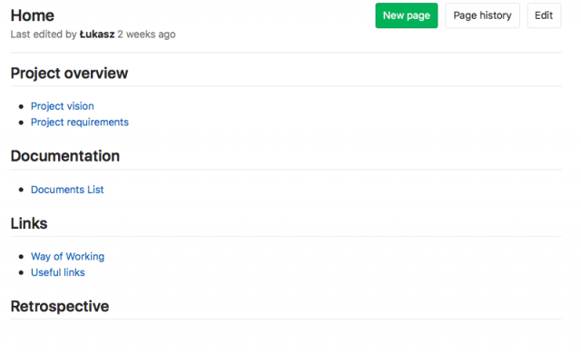 Na wiki pojawił się również szkielet dokumentacji oraz opis projektu, opis zasad pracy z repozytorium i inne ważne elementy: