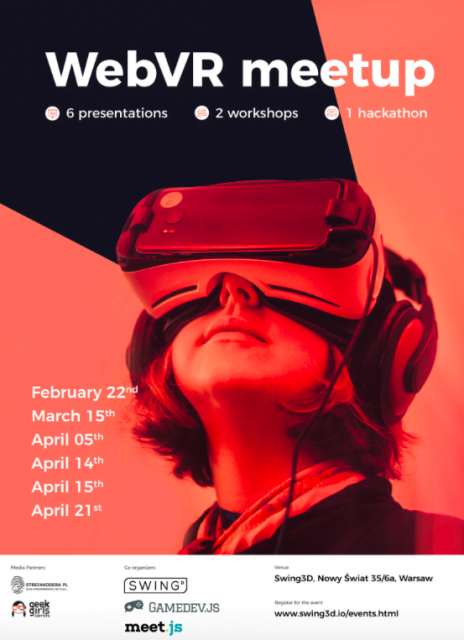 22 lutego o godzinie 18.00 Swing3D, meet.js i gamedev.js startują z serią unikalnych spotkań dotyczących WebVR. Podczas szcześciu prezentacji (w języku angielskim), warsztatach oraz hakatonie uczestnicy mogą zapoznać się z modelowaniem 3D, renderowaniem i frameworkami JavaScript służącymi do tworzenia środowisk 3D.
